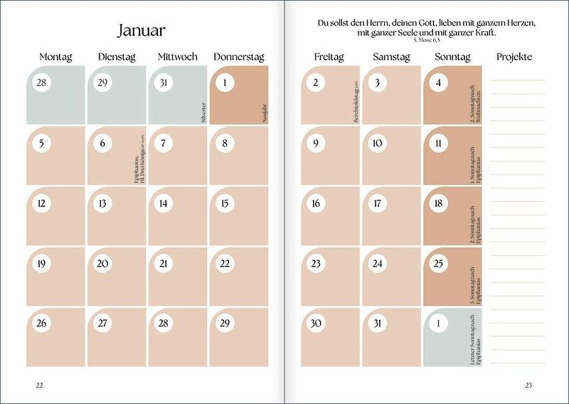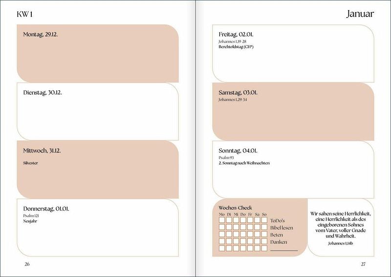 Ankerpunkte 2026Der Navigator im Alltag und GlaubenProduktivität trifft geistliches Leben - der Kalender, der mehr kann."Meine Ankerpunkte 2026" ist weit mehr als ein Organisationstool: Er begleitet Menschen durch ihren Alltag und ihren Glauben.Mit klaren Wochen- und Monatsübersichten, gut erklärten Tools wie der Eisenhower-Matrix und SMART-Zielen sowie täglichen Bibeltexten, Gebetsseiten, Notizseiten und einigen weiteren Angeboten bietet er eine einzigartige Verbindung von Struktur im Alltag und geistlichem Leben.Ideal für Christen, die ihr Leben bewusst gestalten und ihren Glauben im Alltag verankern wollen. Ein inspirierender Begleiter für Beruf, Familie, Gemeinde und persönliche Entwicklung - und damit ein echtes Must-have für jeden christlichen Schreibtisch!Erläuterung der Begriffe:Smart Ziele (SMART Goals): Methode zur Zielsetzung, bei der jedes Ziel spezifische, messbare, ausführbare, relevante und zeitgebundene Kriterien erfüllen muss. Diese Struktur hilft, Ziele klar zu definieren und ihre Erreichung zu erleichtern.Die Eisenhower-Matrix ist eine Zeitmanagement-Methode zur Priorisierung von Aufgaben. Sie hilft, Aufgaben anhand ihrer Wichtigkeit und Dringlichkeit zu ordnen und so effizienter zu arbeiten.