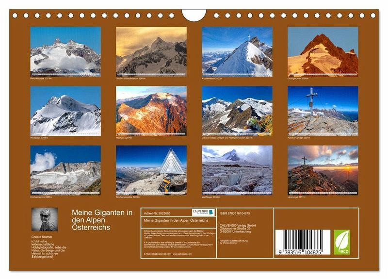 QUALITÄT - Hochwertiger Fotokalender mit 12 wunderschönen Motiven auf lichtbeständigem Bilderdruckpapier, robuste Spiralbindung mit Aufhängebügel.NACHHALTIG - deutliche Abfallreduzierung durch bedarfsgerechte Einzelstückfertigung, umweltfreundliches FSC-zertifiziertes Papier, Produktion in Deutschland, klimabewusste Logistik.PERFEKTES GESCHENK - Kalender für Freunde und Familie, für Kinder und Erwachsene, jung und alt, zu Weihnachten, Geburtstag oder zwischendurch.VIELFALT - Bildkalender in verschiedenen Formaten, z.B. DIN A5, DIN A4, DIN A3 sowie DIN A2. Ob Naturmotiv, Gemälde oder Fotos, ideal für ein persönliches Wohlfühlambiente.Meine höchsten Berge in Österreich von Autor(in): Christa Kramer