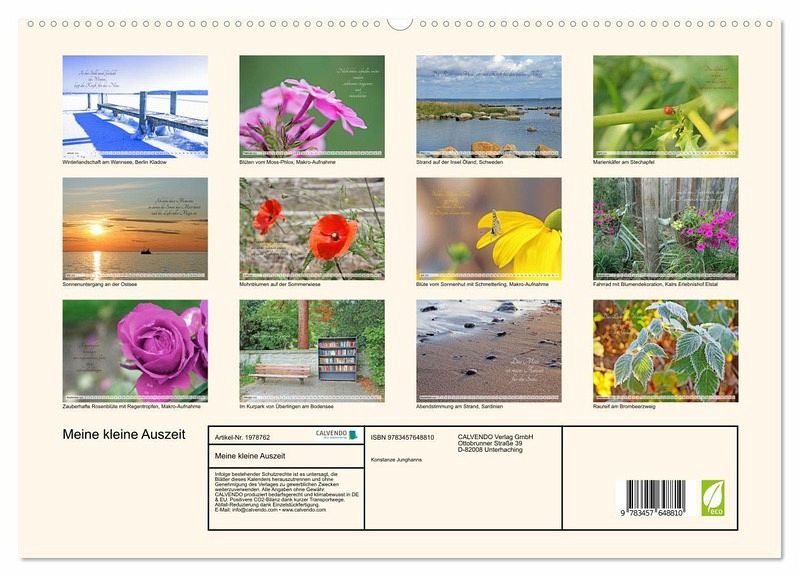 PREMIUM-LINIE - Brillanter Fotokalender mit 12 wunderschönen Motiven, Kunstdruck in Hochglanz in Museumsqualität.QUALITÄT - edle Materialien, stabile Rückwand mit 2 innovativen Einstecktaschen für eine optimale Präsentation an der Wand.NACHHALTIG - deutliche Abfallreduzierung durch bedarfsgerechte Einzelstückfertigung, umweltfreundliches FSC-zertifiziertes Papier, Produktion in Deutschland, klimabewusste Logistik.PERFEKTES GESCHENK - Kalender für Freunde und Familie, für Kinder und Erwachsene, jung und alt, zu Weihnachten, Geburtstag oder zwischendurch.Erholung für Seele um Kraft für Körper und Geist zu schöpfen von Autor(in): Konstanze Junghanns