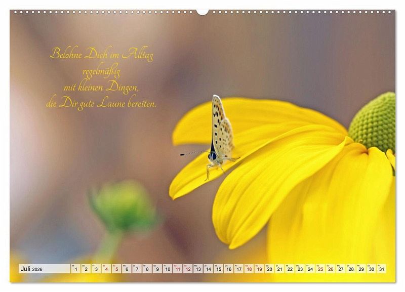 Juli: Blüte vom Sonnenhut mit Schmetterling, Makro-Aufnahme