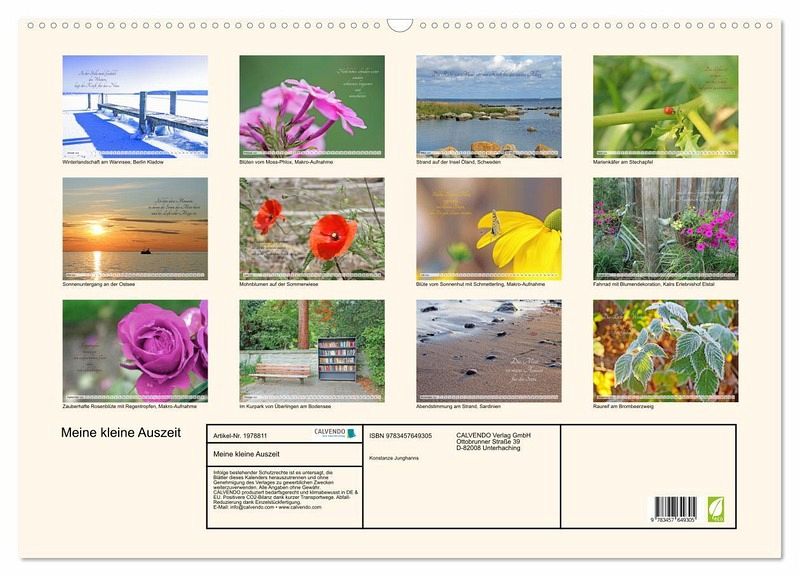 QUALITÄT - Hochwertiger Fotokalender mit 12 wunderschönen Motiven auf lichtbeständigem Bilderdruckpapier, robuste Spiralbindung mit Aufhängebügel.NACHHALTIG - deutliche Abfallreduzierung durch bedarfsgerechte Einzelstückfertigung, umweltfreundliches FSC-zertifiziertes Papier, Produktion in Deutschland, klimabewusste Logistik.PERFEKTES GESCHENK - Kalender für Freunde und Familie, für Kinder und Erwachsene, jung und alt, zu Weihnachten, Geburtstag oder zwischendurch.VIELFALT - Bildkalender in verschiedenen Formaten, z.B. DIN A5, DIN A4, DIN A3 sowie DIN A2. Ob Naturmotiv, Gemälde oder Fotos, ideal für ein persönliches Wohlfühlambiente.Erholung für Seele um Kraft für Körper und Geist zu schöpfen von Autor(in): Konstanze Junghanns