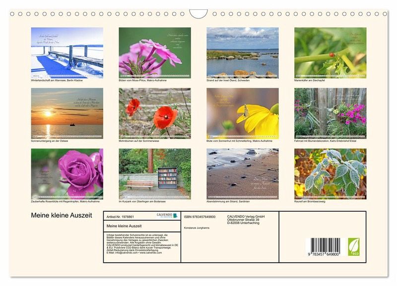 QUALITÄT - Hochwertiger Fotokalender mit 12 wunderschönen Motiven auf lichtbeständigem Bilderdruckpapier, robuste Spiralbindung mit Aufhängebügel.NACHHALTIG - deutliche Abfallreduzierung durch bedarfsgerechte Einzelstückfertigung, umweltfreundliches FSC-zertifiziertes Papier, Produktion in Deutschland, klimabewusste Logistik.PERFEKTES GESCHENK - Kalender für Freunde und Familie, für Kinder und Erwachsene, jung und alt, zu Weihnachten, Geburtstag oder zwischendurch.VIELFALT - Bildkalender in verschiedenen Formaten, z.B. DIN A5, DIN A4, DIN A3 sowie DIN A2. Ob Naturmotiv, Gemälde oder Fotos, ideal für ein persönliches Wohlfühlambiente.Erholung für Seele um Kraft für Körper und Geist zu schöpfen von Autor(in): Konstanze Junghanns