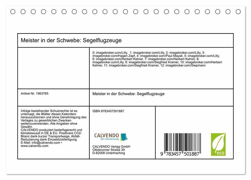 QUALITÄT - Hochwertiger Fotokalender mit 12 wunderschönen Motiven auf lichtbeständigem Bilderdruckpapier, robuste Spiralbindung.NACHHALTIG - deutliche Abfallreduzierung durch bedarfsgerechte Einzelstückfertigung, umweltfreundliches FSC-zertifiziertes Papier, Produktion in Deutschland, klimabewusste Logistik.PERFEKTES GESCHENK - Kalender für Freunde und Familie, für Kinder und Erwachsene, jung und alt, zu Weihnachten, Geburtstag oder zwischendurch.VIELFALT - Bildkalender in verschiedenen Formaten, z.B. DIN A5, DIN A4, DIN A3 sowie DIN A2. Ob Naturmotiv, Gemälde oder Fotos, ideal für ein persönliches Wohlfühlambiente.Segelflieger: Die Nachfahren Otto Lilienthals von Autor(in): CALVENDO Verlag