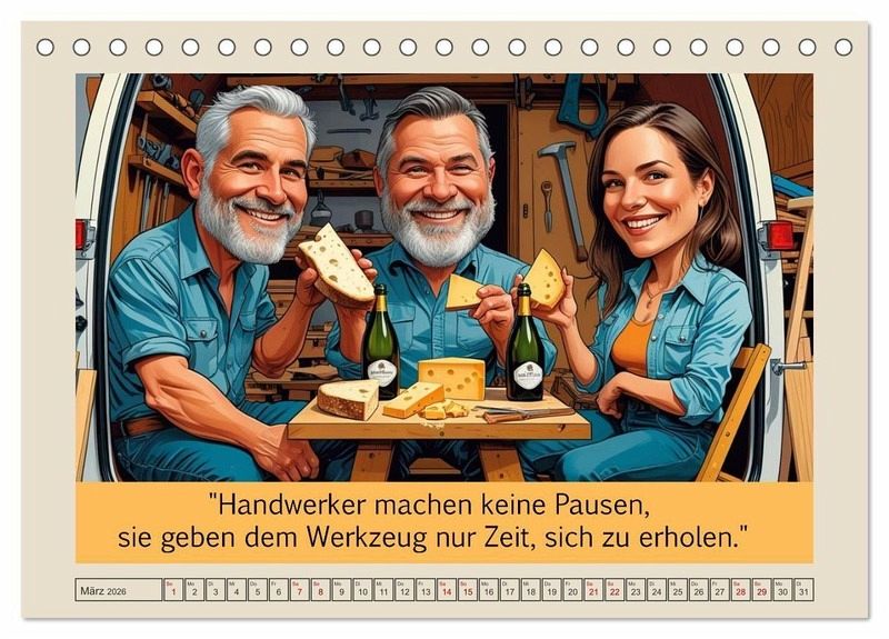 Dieser Kalender zeigt die witzige Seite des Handwerks: Zwölf originelle Karikaturen, die mit viel Liebe mit einer KI gestaltet wurden, treffen auf freche, charmante Handwerker-Sprüche. Egal, ob Profi-Handwerker, Hobby-Heimwerker oder leidenschaftlicher Werkzeug-Sammler - hier kommt jeder auf den (Holz-)Bock!