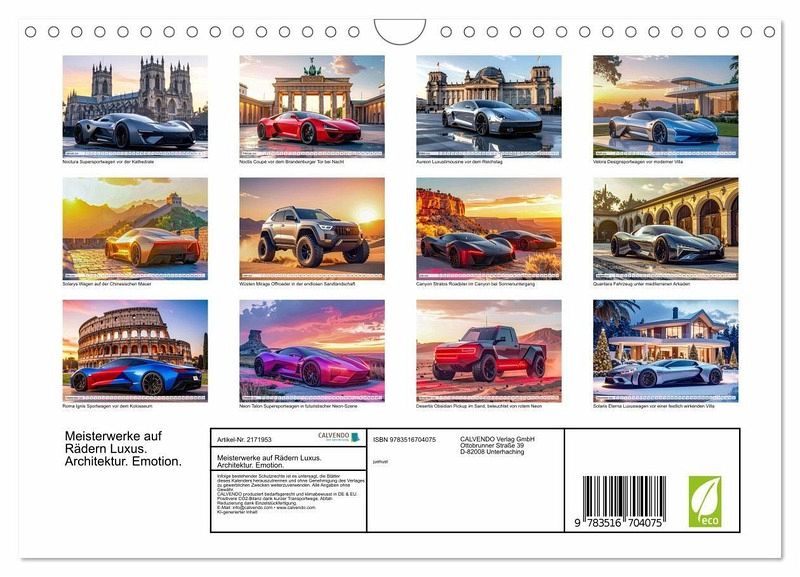 QUALITÄT - Hochwertiger Fotokalender mit 12 wunderschönen Motiven auf lichtbeständigem Bilderdruckpapier, robuste Spiralbindung mit Aufhängebügel.NACHHALTIG - deutliche Abfallreduzierung durch bedarfsgerechte Einzelstückfertigung, umweltfreundliches FSC-zertifiziertes Papier, Produktion in Deutschland, klimabewusste Logistik.PERFEKTES GESCHENK - Kalender für Freunde und Familie, für Kinder und Erwachsene, jung und alt, zu Weihnachten, Geburtstag oder zwischendurch.VIELFALT - Bildkalender in verschiedenen Formaten, z.B. DIN A5, DIN A4, DIN A3 sowie DIN A2. Ob Naturmotiv, Gemälde oder Fotos, ideal für ein persönliches Wohlfühlambiente.Designfahrzeuge vor imposanten Kulissen. von Autor(in): juehust