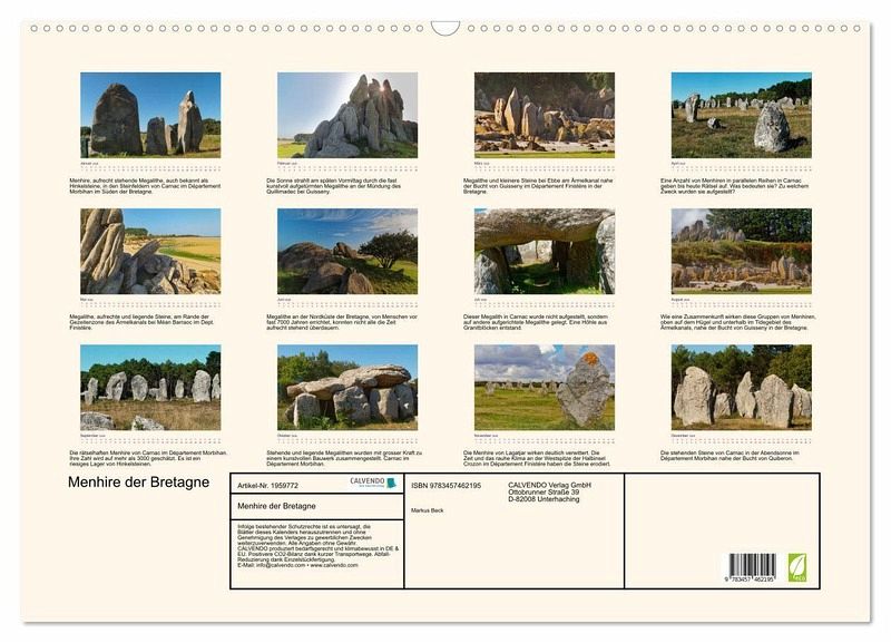 QUALITÄT - Hochwertiger Fotokalender mit 12 wunderschönen Motiven auf lichtbeständigem Bilderdruckpapier, robuste Spiralbindung mit Aufhängebügel.NACHHALTIG - deutliche Abfallreduzierung durch bedarfsgerechte Einzelstückfertigung, umweltfreundliches FSC-zertifiziertes Papier, Produktion in Deutschland, klimabewusste Logistik.PERFEKTES GESCHENK - Kalender für Freunde und Familie, für Kinder und Erwachsene, jung und alt, zu Weihnachten, Geburtstag oder zwischendurch.VIELFALT - Bildkalender in verschiedenen Formaten, z.B. DIN A5, DIN A4, DIN A3 sowie DIN A2. Ob Naturmotiv, Gemälde oder Fotos, ideal für ein persönliches Wohlfühlambiente.Die zahlreichen Megalithen der Bretagne geben noch heute Rätsel auf. von Autor(in): Markus Beck