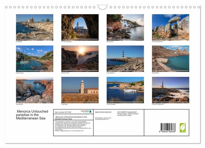 Often forgotten, but maybe that was luck for the island Menorca. No big hotels were built, here you can find nature pure, lonely coves, historic villages and majestic lighthouses. This photographic calendar takes you on a round tour on this beautiful island in the Mediterranean Sea.