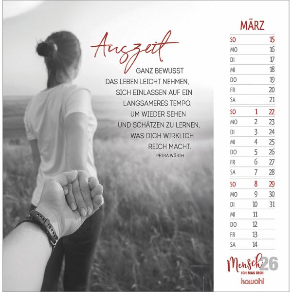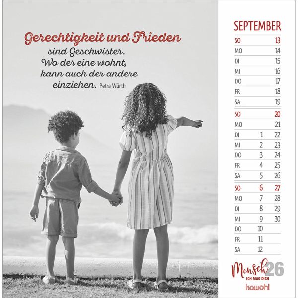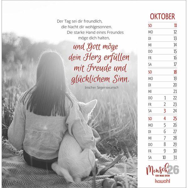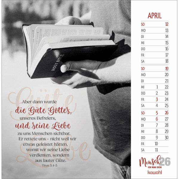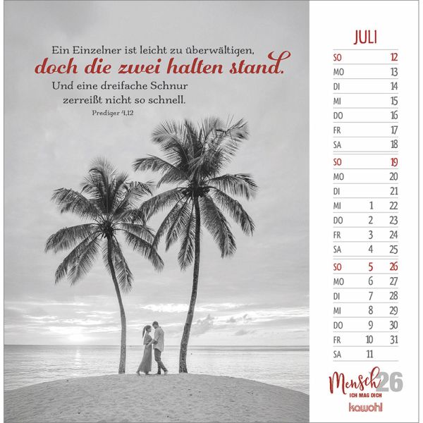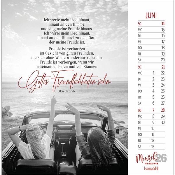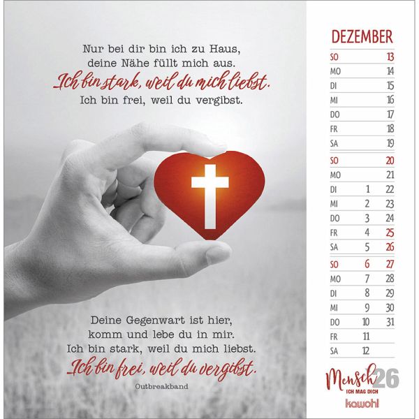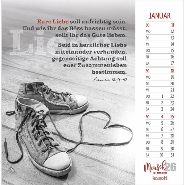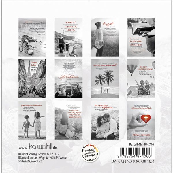 Schwarz-Weiß-Kalender für junge und junggebliebene LeuteInteressante Menschen- und Symbolbilder, ausdrucksstarke Fotos, dazu überraschende Texte. Worte zum Leben und zur Freundschaft, Gedanken zur Liebe.Der seit vielen Jahren beliebte, abwechslungsreiche Kalender mit außergewöhnlichen S/W-Motiven.DAS GESCHENK FÜR JUNGE (und jung gebliebene) LEUTE.Postkarten-Kalender:- mit christlichen Texten- mit Schwarz-Weiß-Motiven mit Farbakzent- Postkartenkarton, Aufsteller- Jubiläumsausgabe - dieser Kalender erscheint bereits zum 30. Mal.