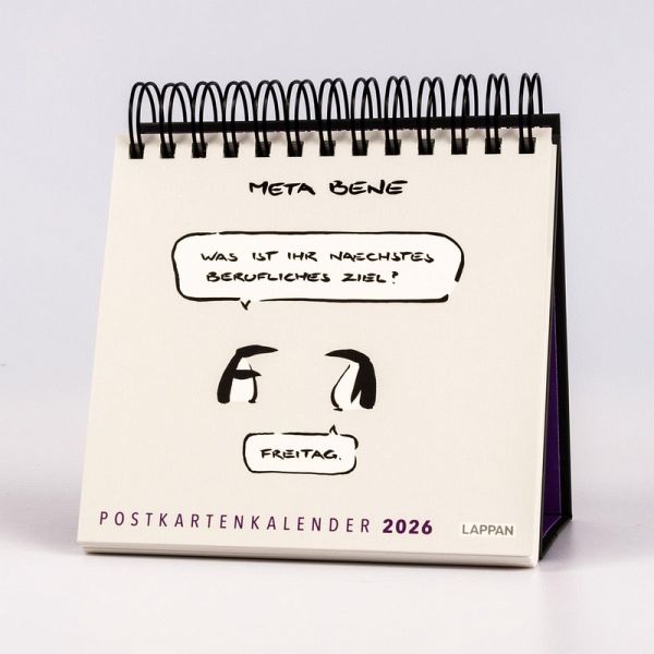meta benes Cartoons begegnen der Welt mit zynischem Optimismus und melancholischer Heiterkeit - die perfekte Mischung, um das Jahr 2026 mit all seinen Widrigkeiten zu überstehen. meta benes feiner Strich und sein tierisches Personal machen jede Postkarte zu einem Kunstwerk, das verschickt, verschenkt oder selbst behalten werden kann.