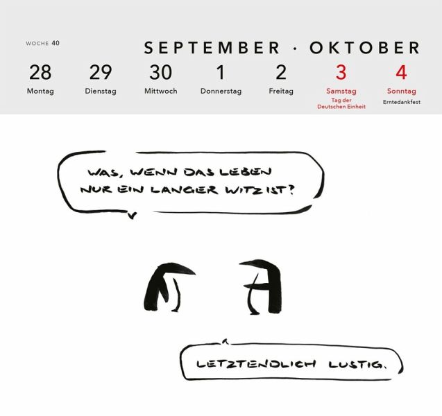SpiralgebundenZum Hinhängen, Aufstellen und Amüsieren53 hochwertige Postkarten zum Verschenken und SammelnPerforation zum einfachen Heraustrennen der KartenWochenübersicht mit Angabe von Feiertagen und Kalenderwoche