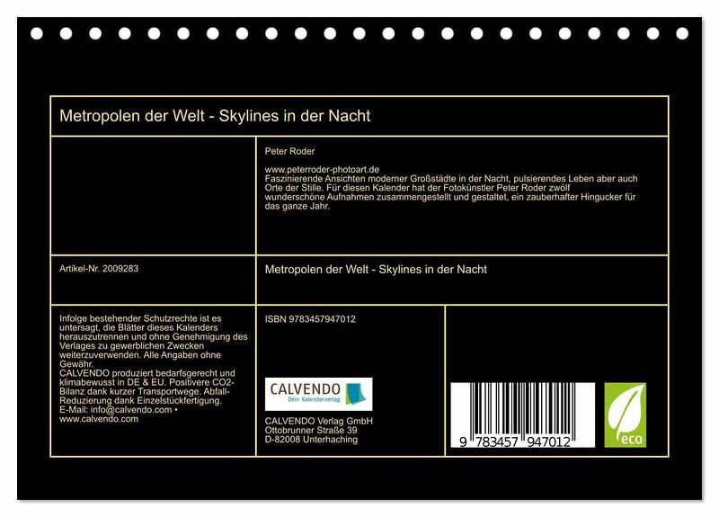 Faszinierende Ansichten moderner Großstädte in der Nacht, pulsierendes Leben aber auch Orte der Stille. Für diesen Kalender hat der Fotokünstler Peter Roder zwölf wunderschöne Aufnahmen zusammengestellt und gestaltet, ein zauberhafter Hingucker für das ganze Jahr.