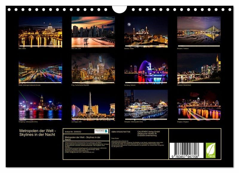 Faszinierende Ansichten moderner Großstädte in der Nacht, pulsierendes Leben aber auch Orte der Stille. Für diesen Kalender hat der Fotokünstler Peter Roder zwölf wunderschöne Aufnahmen zusammengestellt und gestaltet, ein zauberhafter Hingucker für das ganze Jahr.