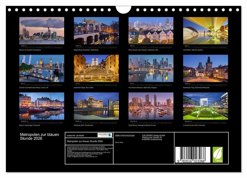 Der Fotograf Rainer Mirau ist jedes Jahr viele Wochen in Großstädten weltweit unterwegs, um die schönsten Motive im Perfektion einzufangen. In diesem wunderschön zusammengestellten Kalender zeigt er ausschließlich Aufnahmen zur blauen Stunde, denn nur dann ist das Licht einzigartig!