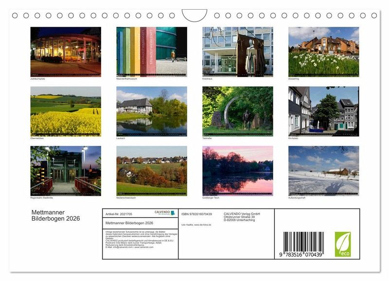 QUALITÄT - Hochwertiger Fotokalender mit 12 wunderschönen Motiven auf lichtbeständigem Bilderdruckpapier, robuste Spiralbindung mit Aufhängebügel.NACHHALTIG - deutliche Abfallreduzierung durch bedarfsgerechte Einzelstückfertigung, umweltfreundliches FSC-zertifiziertes Papier, Produktion in Deutschland, klimabewusste Logistik.PERFEKTES GESCHENK - Kalender für Freunde und Familie, für Kinder und Erwachsene, jung und alt, zu Weihnachten, Geburtstag oder zwischendurch.VIELFALT - Bildkalender in verschiedenen Formaten, z.B. DIN A5, DIN A4, DIN A3 sowie DIN A2. Ob Naturmotiv, Gemälde oder Fotos, ideal für ein persönliches Wohlfühlambiente.Impressionen aus der Bergischen Kreisstadt Mettmann von Autor(in): Udo Haafke