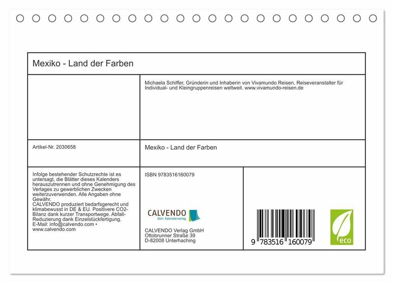 QUALITÄT - Hochwertiger Fotokalender mit 12 wunderschönen Motiven auf lichtbeständigem Bilderdruckpapier, robuste Spiralbindung.NACHHALTIG - deutliche Abfallreduzierung durch bedarfsgerechte Einzelstückfertigung, umweltfreundliches FSC-zertifiziertes Papier, Produktion in Deutschland, klimabewusste Logistik.PERFEKTES GESCHENK - Kalender für Freunde und Familie, für Kinder und Erwachsene, jung und alt, zu Weihnachten, Geburtstag oder zwischendurch.VIELFALT - Bildkalender in verschiedenen Formaten, z.B. DIN A5, DIN A4, DIN A3 sowie DIN A2. Ob Naturmotiv, Gemälde oder Fotos, ideal für ein persönliches Wohlfühlambiente.Mexiko, ein absolutes Traumreiseland von Autor(in): Michaela Schiffer