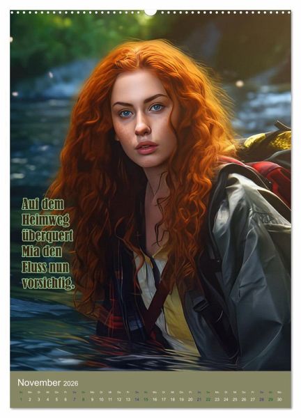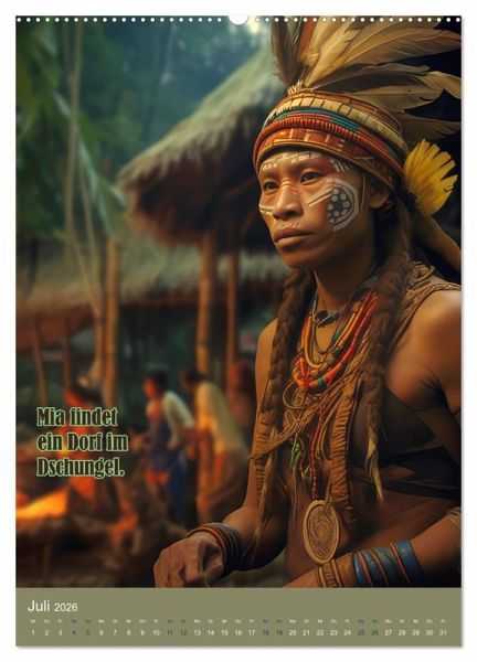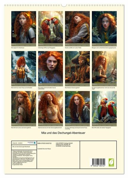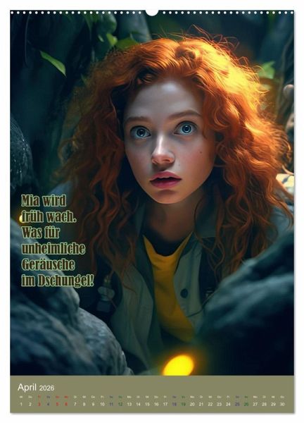 Willkommen zum Kalender Mia und das Dschungel- Abenteuer. Begleite Mia auf ihrer aufregenden Reise durch den Dschungel, wo sie auf exotische Papageien trifft und das Dschungeldorf findet. Erlebe, wie sie beinahe im Fluss ertrinkt und schließlich ein Fest mit den freundlichen Dschungelbewohnern feiert. Mia, mit ihrem roten welligen Haar und ihrer Entdeckerkleidung, wird dich auf eine unvergessliche Reise mitnehmen. Dieser Kalender ist perfekt für alle Abenteurer und Naturliebhaber, die den Dschungel hautnah erleben möchten. Ob für jung oder alt, die mit Hilfe der KI erstellten fantasievollen Bilder begeistern einfach. Bestelle jetzt deinen Kalender Mia und das Dschungel-Abenteuer und lass dich von Mias Geschichte inspirieren.