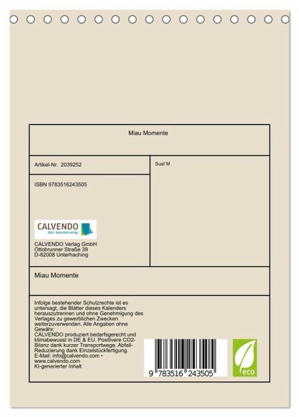 QUALITÄT - Hochwertiger Fotokalender mit 12 wunderschönen Motiven auf lichtbeständigem Bilderdruckpapier, robuste Spiralbindung.NACHHALTIG - deutliche Abfallreduzierung durch bedarfsgerechte Einzelstückfertigung, umweltfreundliches FSC-zertifiziertes Papier, Produktion in Deutschland, klimabewusste Logistik.PERFEKTES GESCHENK - Kalender für Freunde und Familie, für Kinder und Erwachsene, jung und alt, zu Weihnachten, Geburtstag oder zwischendurch.VIELFALT - Bildkalender in verschiedenen Formaten, z.B. DIN A5, DIN A4, DIN A3 sowie DIN A2. Ob Naturmotiv, Gemälde oder Fotos, ideal für ein persönliches Wohlfühlambiente.__Miau Momente:__ Ein Kalender mit KI-generierten, herzerwärmenden Katzenbildern, der Sie 12 Monate lang mit niedlichen und verspielten Kätzchen in ihrer vollen Pracht begleitet - ideal für Liebhaber von Natur und farben von Autor(in): Ewell Maria