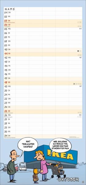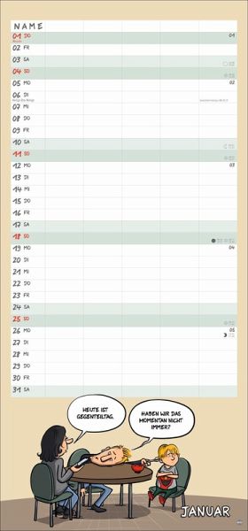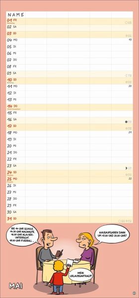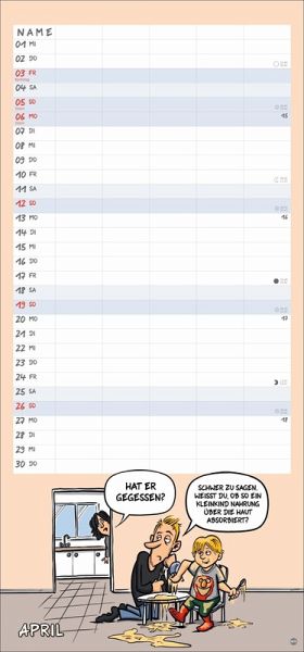 - Damit Sie im Alltag weder den Überblick noch Ihren Humor verlieren: der neue Michael-Holtschulte-Familienkalender 2026- Monatskalender mit erfrischen-lustigen Cartoons über Familien am Rande des Wahnsinns und das Leben mit Kleinkindern- Organisationshilfe für Groß und Klein: mit Schulferien, Stundenplänen und 3-Monats-Vorschau auf 2027, im kompakten 21 x 45 cm Hochformat- Das Raumwunder unter den Familienplanern: 5 Spalten Platz für wichtige Termine, Ferien- und Freizeitaktivitäten- Gemeinsam schöner Pläne schmieden: Die Familien-Wandkalender von Heye aus dem Athesia Kalenderverlag