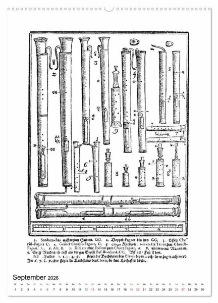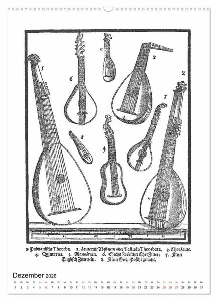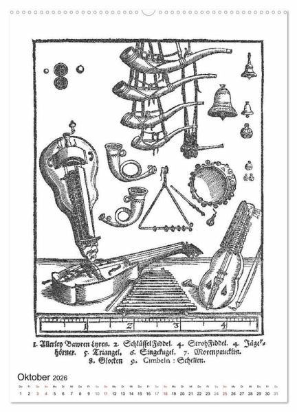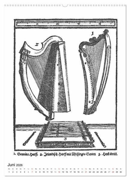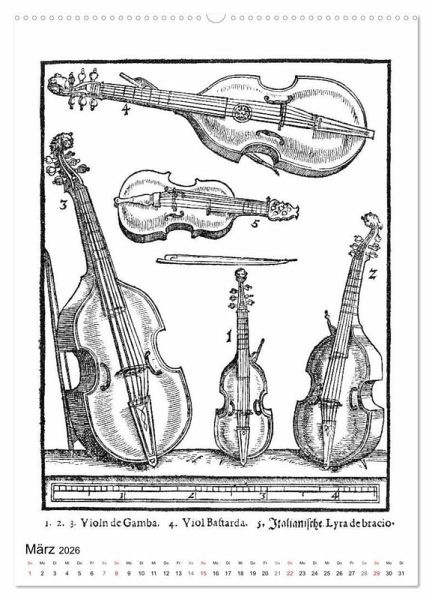 Unser Kalender zeigt u.a.: Posaunen, Zinken, Cornetts, Blockflöten, Querflöten, Pommern, Schalmeien, Krummhörner, Sackpfeife, Harfen, Hackbrett, Sordunen, Schreierpfeifen, Fagotte, Rackette, Drehleier, Fideln, Geigen, Theorben, Zithern.