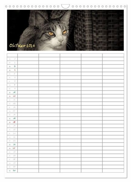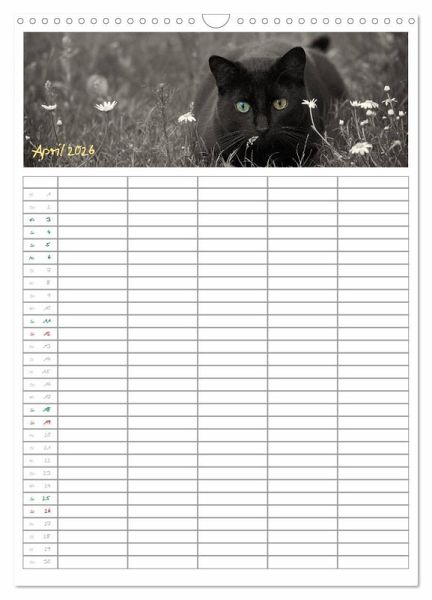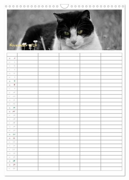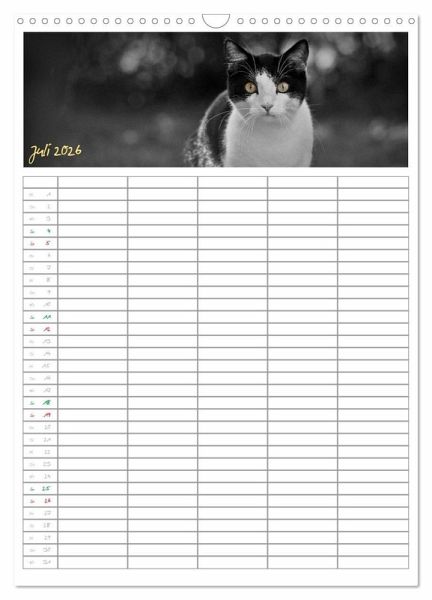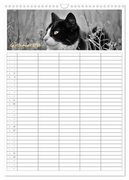 Die typischen Posen der Hauskatze, wie wir sie lieben, fotografisch wunderbar umgesetzt in schwarz-weiss und teilkolorierten Aufnahmen. 5-spaltiger Planungskalender für die ganze Familie oder der Berufsalltag.
