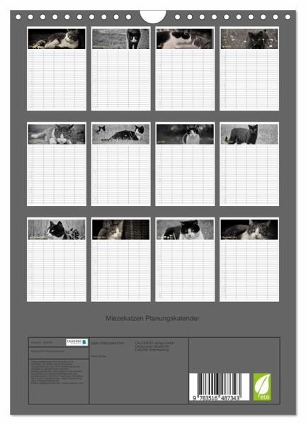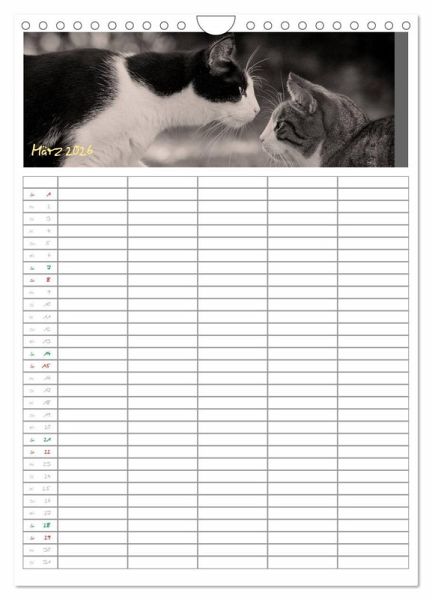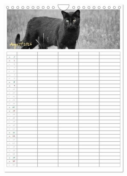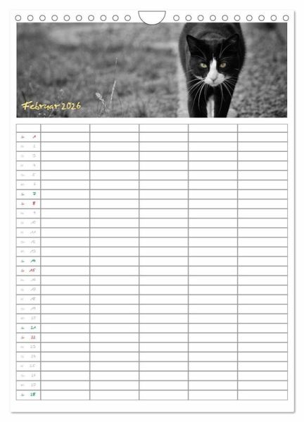 Die typischen Posen der Hauskatze, wie wir sie lieben, fotografisch wunderbar umgesetzt in schwarz-weiss und teilkolorierten Aufnahmen. 5-spaltiger Planungskalender für die ganze Familie oder der Berufsalltag.