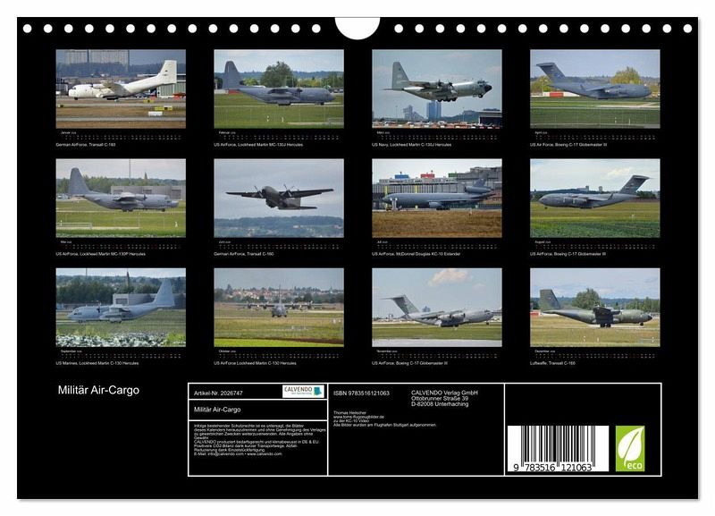 Das ist ein Kalender mit 12 ausgesuchte Bilder von Flugzeugen die nur bei dem Militär im Einsatz kommen, von Hilfstransporte bis Tankflugzeug