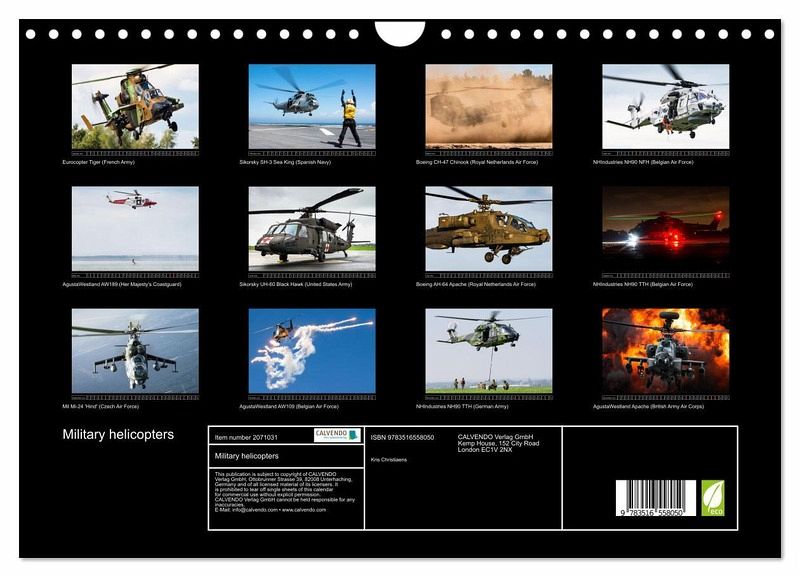 QUALITY - High-quality photo calendar with 12 beautiful images on light-resistant paper, robust spiral binding with hanger.SUSTAINABLE - Significant waste reduction due to print-on-demand production, environmentally friendly FSC-certified paper, produced in the UK, climate-conscious logistical processes.PERFECT GIFT - calendars for friends and family, for children, all ages and all occasions, from Christmas to birthdays and everything in between.LOTS OF CHOICE - Wall calendars in different sizes (DIN A4 and DIN A3),for any topic and personal taste, featuring photography, painting and illustrations.Impressive photos of military helicopters., author: Kris Christiaens