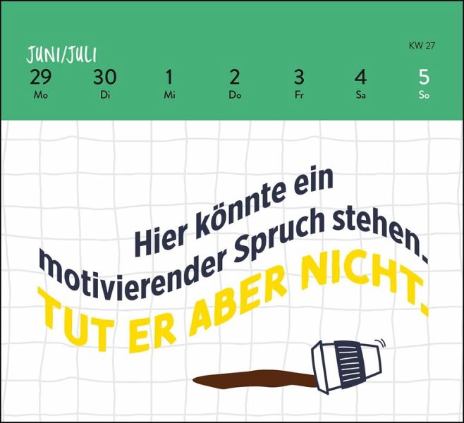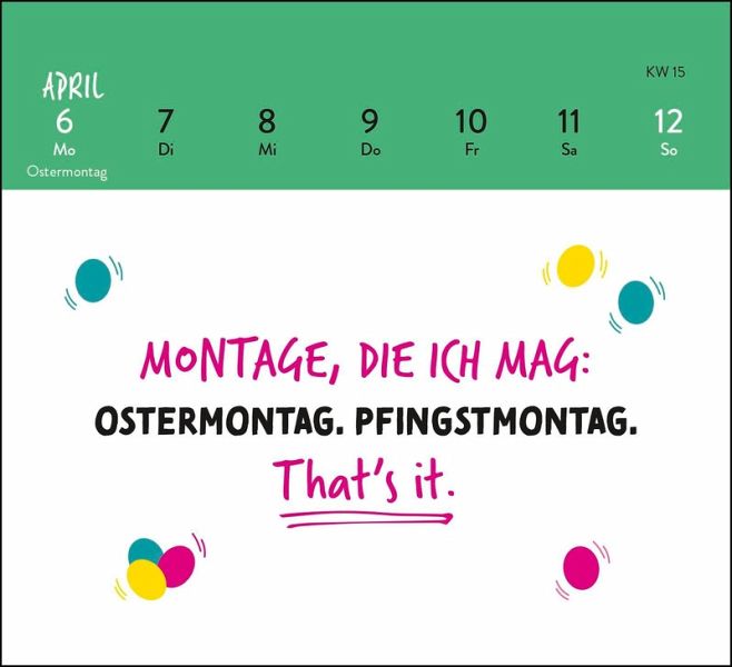 Motivationskick gegen den Montagsblues: Begegne dem (Arbeits-)Leben mit Ironie und HumorKleiner Tischkalender zum Aufstellen (Format 13,5 x 14 cm) mit Wochenkalendarium und SpiralbindungMit Platz für Notizen auf der Rückseite der KalenderblätterEin tolles Geschenk für Kolleg:innen und Freund:innen, die Sinn für Ironie und (schwarzen) Humor haben