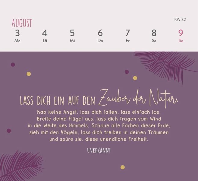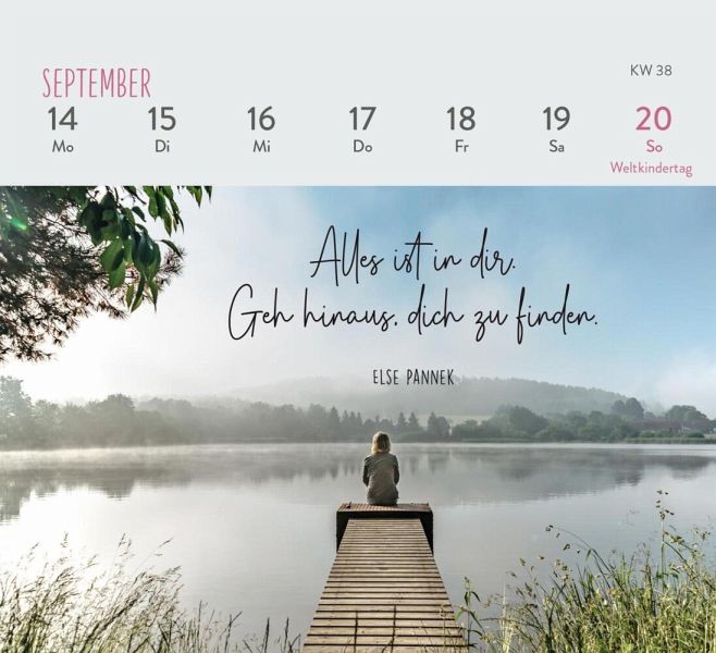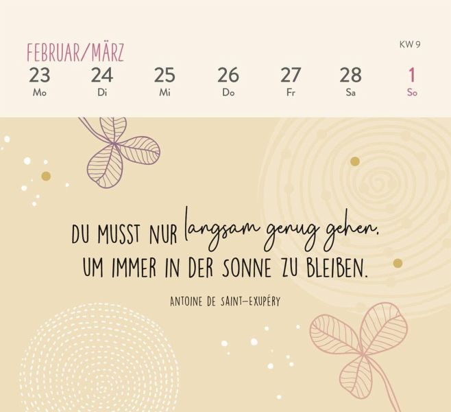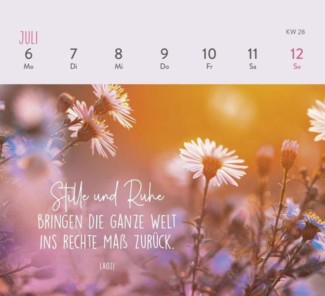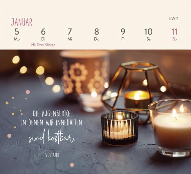 Kleiner Tischkalender zum Aufstellen (Format 13,5 x 14 cm) mit WochenkalendariumStabile Spiralbindung für einfaches Umblättern der SeitenMit Platz für Notizen auf der Rückseite der KalenderblätterNimm dir Zeit zum Durchatmen im Hier und Jetzt