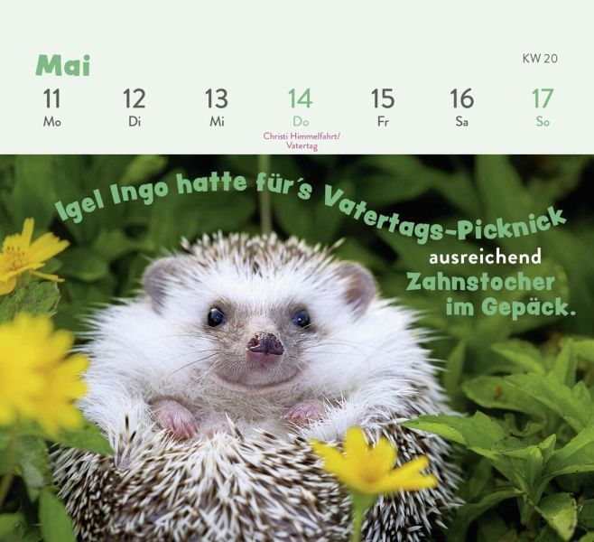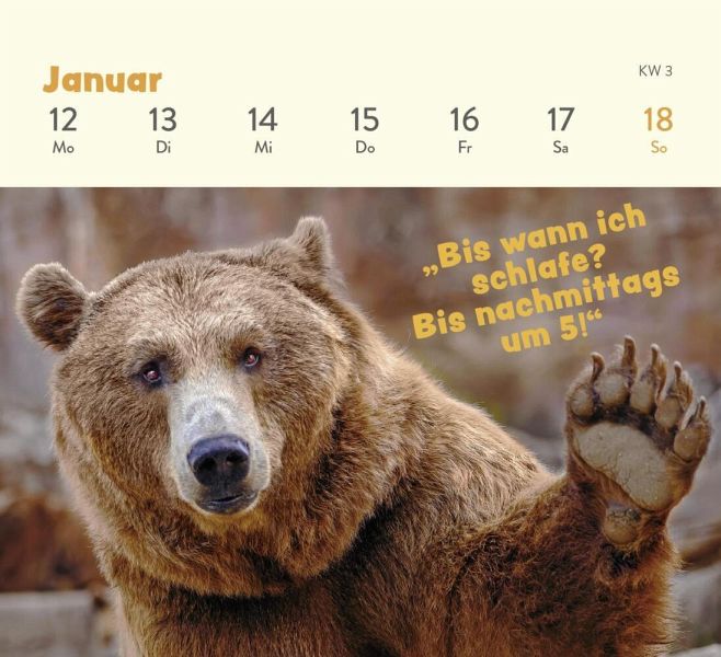 Wochenkalender zum Aufstellen für alle Fans von niedlichen Tieren (Maße: 13,5 x 14,0 cm)Mit humorvollen Sprüchen von Comedy-Autor Paulus Vennebusch1 Blatt pro Woche mit übersichtlichem Kalendarium und Notizfunktion auf der RückseiteMit stabiler Spiralbindung für einfaches UmblätternEin echter Blickfang im Büro oder zu Hause