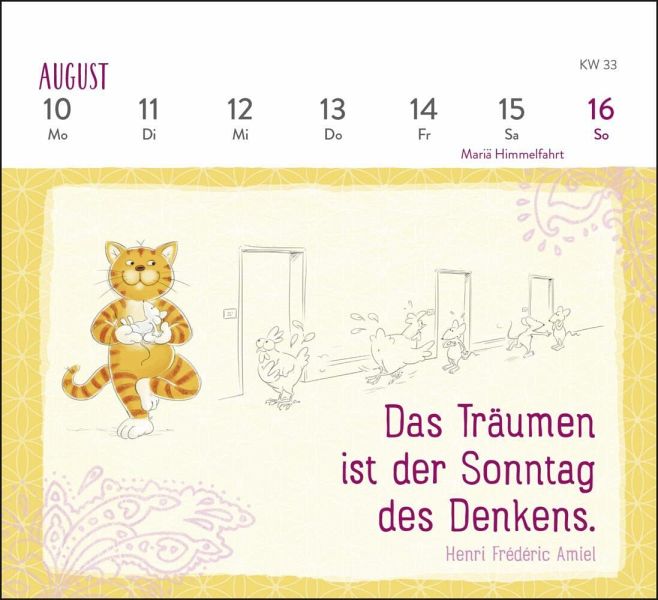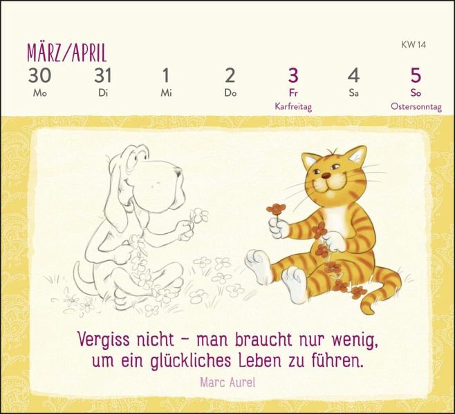 Die Om-Katze verhilft mit diesem kleinen Tischkalender dank fröhlicher Zitate und niedlicher Illustrationen zu einem entspannten Jahr 2026. Mit 53 Zitaten und Weisheiten erinnert sie dich jede Woche daran, dem Leben mit der nötigen Gelassenheit und Zuversicht zu begegnen. Durch die praktische Spiralbindung steht der Kalender stabil auf jedem Untergrund und die Wochenblätter lassen sich ganz einfach umblättern. Auf der Rückseite jedes Kalenderblatts findest du Platz für kleine Notizen. Die witzigen Illustrationen von Lisa Manneh machen den Tischkalender zu einem fröhlichen Ruhepol am Arbeitsplatz oder Zuhause.