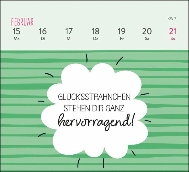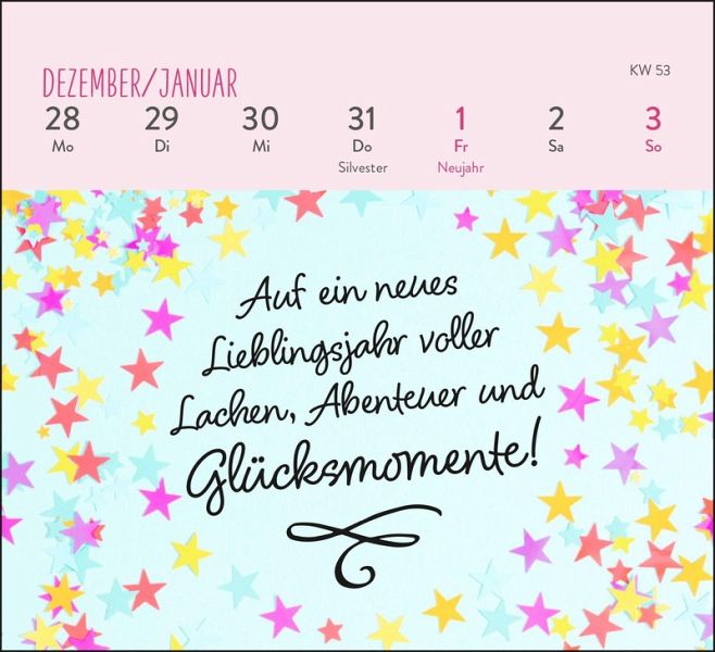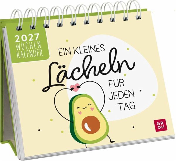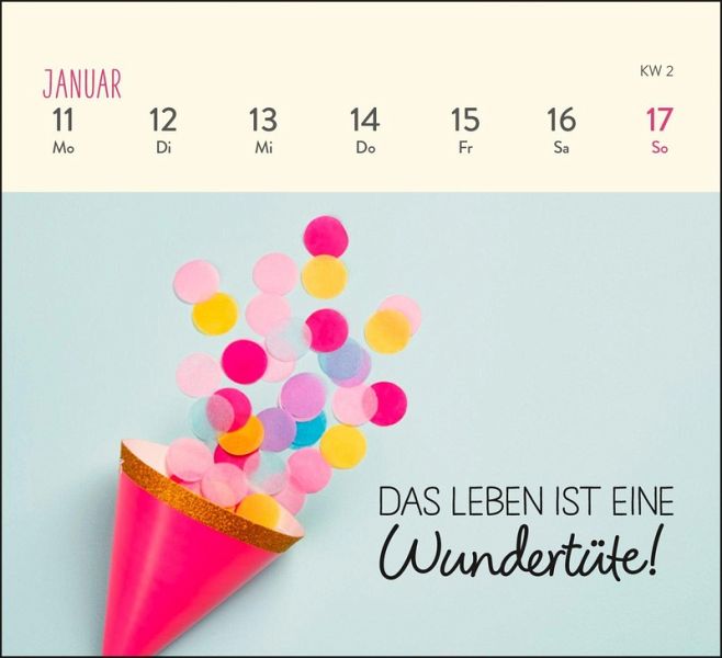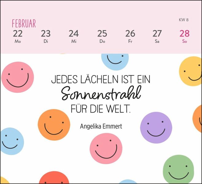 Gute-Laune-Kalender 2027 zum Aufstellen Du möchtest jemandem ein Lächeln schenken? Mit diesem Wochenkalender Ein kleines Lächeln für jeden Tag 2027 gelingt das garantiert! Jede Woche erwartet dich ein Spruch rund um die Themen Lachen, Lebensfreude und Glück, die dir bestimmt ein Lächeln ins Gesicht zaubern werden. Die Botschaft hinter dem Kalender: "Genieße das Leben, sei fröhlich und gehe mit einem Lächeln durch den Tag! Denn schon das kleinste Lächeln macht jeden Moment zu etwas Besonderem." Ein echter Blickfang für jedes Zuhause Durch die praktische Spiralbindung steht der Kalender stabil auf jedem Untergrund und die Wochenblätter lassen sich ganz einfach umblättern. Auf der Rückseite jedes Kalenderblatts ist Platz für kleine Notizen. So kannst du die schönsten Kalenderblätter nach Ablauf der Woche auch mit kleinen Botschaften an Freunde und Familie weitergeben und ihnen eine kleine Freude machen. * Fröhlicher Gute-Laune-Kalender 2027 zum Aufstellen mit Wochenkalendarium * Für mehr Momente der Freude, die dich durchs ganze Jahr begleiten * Aufstellkalender mit stabiler Spiralbindung und Platz für Notizen auf den Rückseiten der Kalenderblätter * Wochenkalender 2027 mit 108 Seiten (Maße: 13,5 x 14,0 cm) * Tolles Geschenk für die Mutter, Freundin oder eine liebe Nachbarin Zaubere dir und anderen ein Lächeln ins Gesicht - denn wer lacht, hat mehr vom Leben!