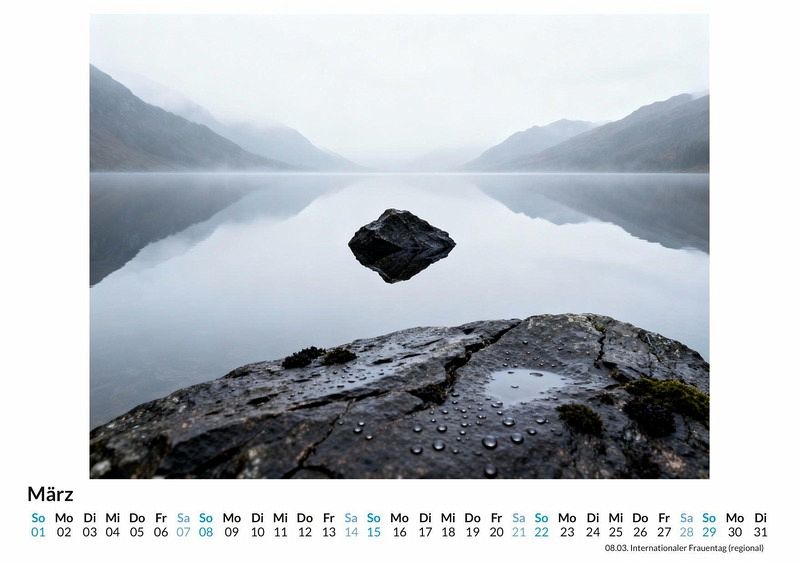 Stille, Klarheit und die Konzentration auf das Wesentliche. In der Natur finden sich unzählige Momente von purer, unverfälschter Schönheit, die oft im Detail verborgen liegen und eine besondere Ruhe ausstrahlen. Dieser Kalender ist eine ideale Wahl: * Für Liebhaber von minimalistischem Design und klarer Ästhetik. * Für Menschen, die sich nach Ruhe und visueller Harmonie in ihren Räumen sehnen. * Für alle, die eine moderne Interpretation von Naturdarstellungen suchen. Der Kalender "Minimalistische Natur-Ästhetik" fängt genau diese Essenz ein. Zwölf Motive, die die Stille eines nebligen Morgens, die zarte Struktur eines Blattes oder die sanfte Linie eines Dünenkamms in den Fokus rücken. Jede dieser Kompositionen wurde aus einer Fülle von digitalen Natureindrücken berechnet und zu einer neuen visuellen Realität geformt. Die Bilder konzentrieren sich auf Form, Farbe sowie Licht und lassen alles Überflüssige weg, um eine ruhige und aufgeräumte Atmosphäre zu schaffen. Mit dem Kauf dieses Kalenders kann man Folgendes erwarten: * Zwölf sorgfältig ausgewählte, reduzierte Naturmotive. * Einen Wandkalender, der sich dezent in verschiedene Einrichtungsstile einfügt. * Eine Quelle der visuellen Ruhe für jeden Tag des Jahres. Dieser Kalender ist mehr als ein Zeitmesser; er ist ein Statement für die Kraft der Reduktion. Eine Begleitung durch das Jahr, die immer wieder dazu anregt, die Schönheit im Einfachen zu entdecken. Es lohnt sich, einen Blick auf die einzelnen Monatsblätter zu werfen.