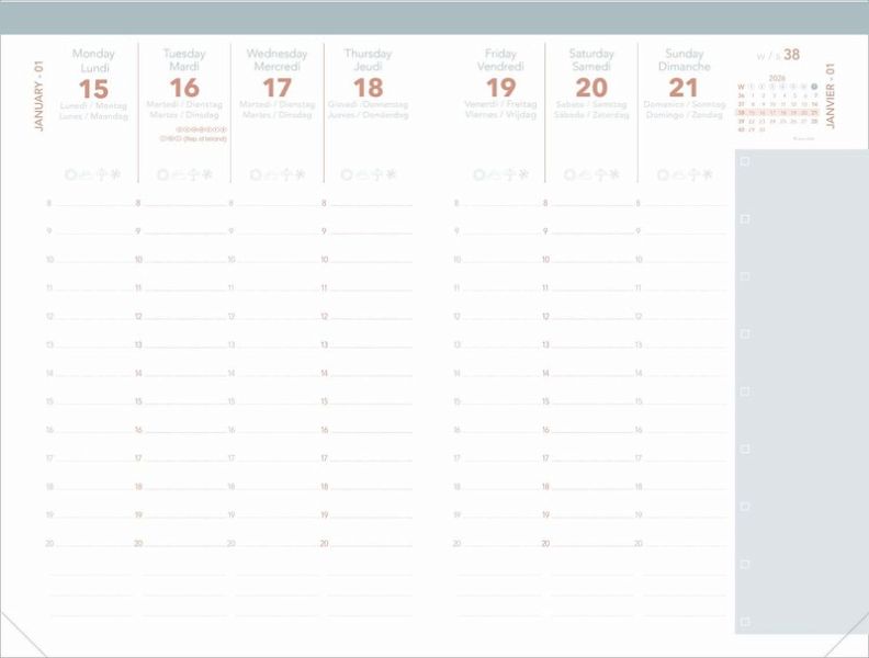 Quo Vadis - Terminkalender - 2026 - Minister - Die Woche Planning - Mehrsprachig - Pastel - Hellgrün - Dez/Dez - 16x24 cm - Clairefo ntaine-Papier Weiß - Hergestellt in Frankreich Wochenkalender mit einer doppelseitigen Übersicht Wochenübersicht - die ganze Woche auf einen Blick Enthält auf jeder Doppelseite einen freien Bereich zum Notieren wichtiger Informationen (zu kontaktierende Personen, zu erledigende Dinge usw.) Papier Clairefontaine, weiß, für ein glattes und flüssiges Schreibgefühl, perforierte abreißbare Ecken für eine einfache Orientierung Fester Deckel, um das ganze Jahr zu halten Sicherer Gummibandverschluss