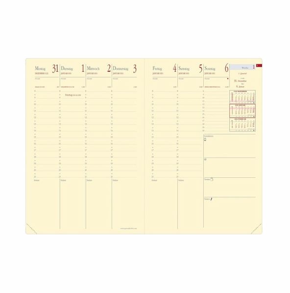Quo Vadis - Terminkalender - 2026 - Minister S Prestige - Die Woche Planning - Deutsch - Soho - Rot - Dez/Dez - 16x24 cm - Clairefon taine-Papier Elfenbein - Hergestellt in Frankreich Wochenkalender mit einer doppelseitigen Übersicht Wochenübersicht - die ganze Woche auf einen Blick Enthält auf jeder Doppelseite einen freien Bereich zum Notieren wichtiger Informationen (zu kontaktierende Personen, zu erledigende Dinge usw.) Papier Clairefontaine, Elfenbein, für ein glattes und flüssiges Schreibgefühl, perforierte abreißbare Ecken für eine einfache Orient ierung Abnehmbarer Deckel und nachfüllbarer Inhalt für eine lange Verwendung Aufbewahrungstaschen für kleine Dokumente und ein herausnehmbares Verzeichnis für Ihre Kontakte