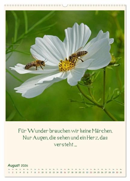 Monat für Monat erfreuen uns Blumen und Blüten. Die Fotografin zeigt eindrucksvoll, wie wunderschön gerade auch die kleinen oder unscheinbaren Blümchen sind, wenn man sie mit dem Herzen sieht. Ganz nach dem Motto von Hans Christian Andersen: "Leben ist nicht genug, sagte der Schmetterling. Sonnenschein, Freiheit und eine kleine Blume gehören dazu". Dieses Zitat finden Sie unter anderen in diesem Kalender.