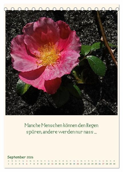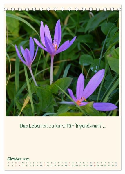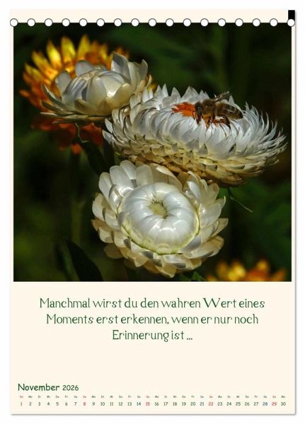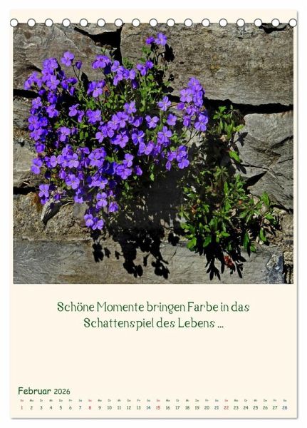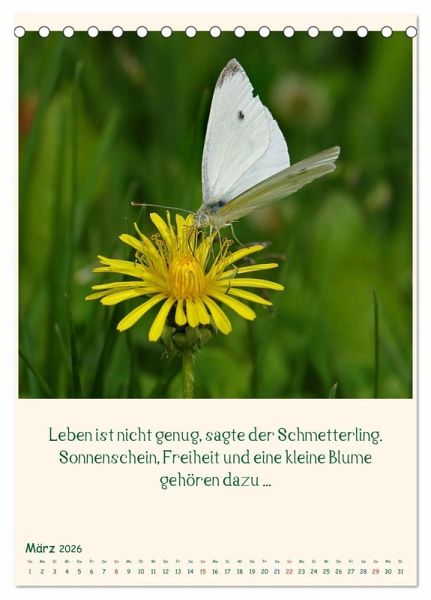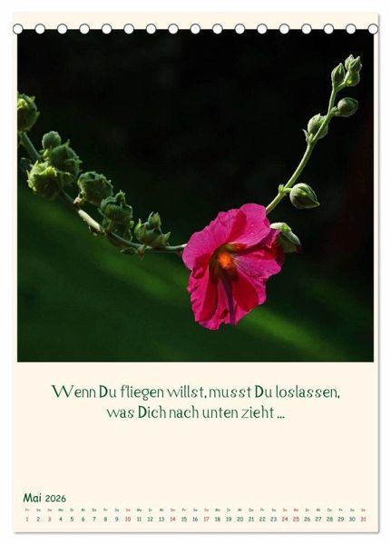 Monat für Monat erfreuen uns Blumen und Blüten. Die Fotografin zeigt eindrucksvoll, wie wunderschön gerade auch die kleinen oder unscheinbaren Blümchen sind, wenn man sie mit dem Herzen sieht. Ganz nach dem Motto von Hans Christian Andersen: "Leben ist nicht genug, sagte der Schmetterling. Sonnenschein, Freiheit und eine kleine Blume gehören dazu". Dieses Zitat finden Sie unter anderen in diesem Kalender.