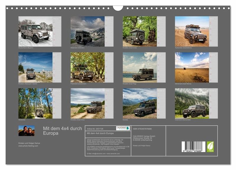 QUALITÄT - Hochwertiger Fotokalender mit 12 wunderschönen Motiven auf lichtbeständigem Bilderdruckpapier, robuste Spiralbindung mit Aufhängebügel.NACHHALTIG - deutliche Abfallreduzierung durch bedarfsgerechte Einzelstückfertigung, umweltfreundliches FSC-zertifiziertes Papier, Produktion in Deutschland, klimabewusste Logistik.PERFEKTES GESCHENK - Kalender für Freunde und Familie, für Kinder und Erwachsene, jung und alt, zu Weihnachten, Geburtstag oder zwischendurch.VIELFALT - Bildkalender in verschiedenen Formaten, z.B. DIN A5, DIN A4, DIN A3 sowie DIN A2. Ob Naturmotiv, Gemälde oder Fotos, ideal für ein persönliches Wohlfühlambiente.Unterwegs mit dem Geländewagen in Europa, abseits der Hauptrouten. von Autor(in): Kirsten Karius
