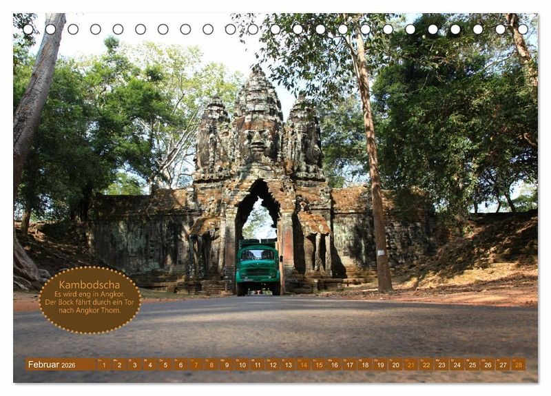 Februar: Kambodscha - Es wird eng in Angkor. Der Bock fährt durch ein Tor nach Angkor Thom.