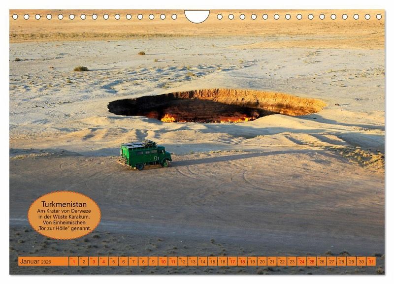 Januar: Turkmenistan - Am Krater von Derweze in der Wüste Karakum. Von Einheimischen "Tor zur Hölle" genannt.