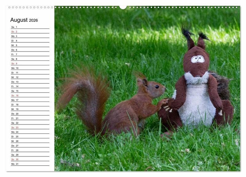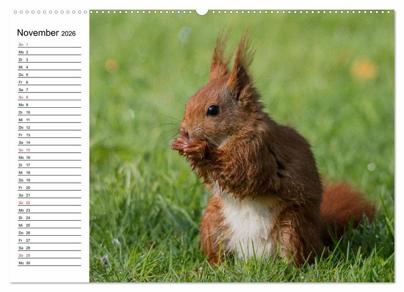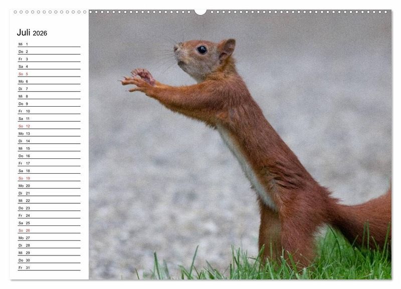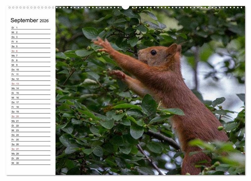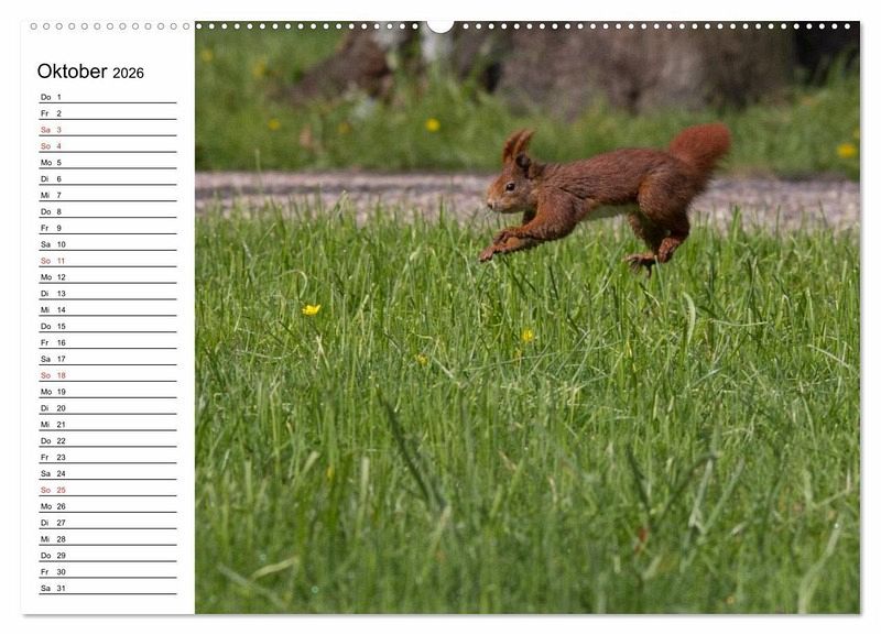 Bei einem spätsommerlichen Spaziergang durch den Park ist es nicht ungewöhnlich, einem Eichhörnchen zu begegnen und es beim Sammeln von Vorräten für den Winter zu beobachten. Aber auch zu den anderen Jahreszeiten kann man sie entdecken. Im Frühjahr sieht man mit etwas Glück vielleicht ein Junghörnchen bei einem seiner ersten Ausflüge. Ein ganz besonderes, weil seltenes Erlebnis aber ist es, einem Eichhörnchen zuzuschauen, das durch die verschneite Winterlandschaft springt. Aber ganz gleich, ob Frühjahr, Sommer, Herbst oder Winter, Eichhörnchen sind immer faszinierende Tiere. Diese Eindrücke soll der Kalender vermitteln.