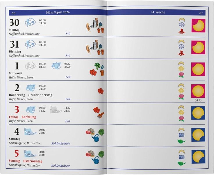 Der Föger-Bestseller ist ein echter Renner, seit über 25 Jahren der meistverkaufte Mondkalender im deutschen Sprachraum. Dieser vierfarbige und aufwendig mit Lesebändchen gestaltete Taschenkalender in Flexobroschur bietet wertvolle und unverzichtbare Mondinfos sowie Tipps für viele Lebenslagen: Mondphasen und Mondstände mit genauen Zeitangaben, Interessantes zu den Themen Gesundheit, Körperpflege, Garten, Landwirtschaft, Reisen, Geld und zwischenmenschliche Harmonie.