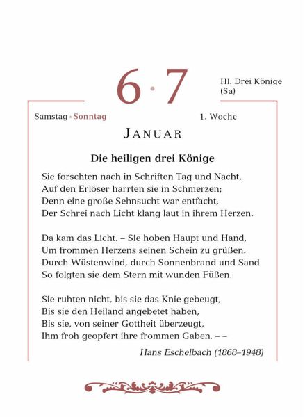 Die einzelnen Tagesblätter sind schön gestaltet, dass man sicher das eine oder andere Blatt sammelt. Der Abreißkalender eignet sich sowohl als Wandkalender, aber noch mehr als Schreibtischkalender. Dafür besitzt er eine äußerst stabile Rückwand zum Aufstellen. Ein willkommener Kalender, der jeden Tag einen lyrischen Start in den Alltag garantiert.