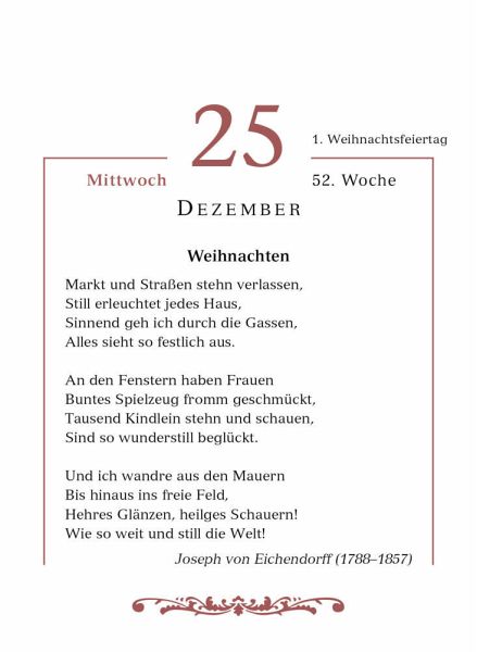 Der Abreißkalender im Format 15 x 11 cm bringt jeden Tag (Sa und So werden dabei zu einem Wochenendtag zusammengefasst) ein kurzes Gedicht, das mitunter einen Bezug zum jeweiligen Tag oder zur Jahreszeit hat. Den Auftakt macht der Vers „Neujahrsglocken“ von Conrad Ferdinand Meyer. Im Januar und Februar findet man dann vermehrt Wintergedichte, während im März der Frühling Vorrang hat oder im Mai Liebesgedichte dominieren. So kommen z.B. am Schalttag Karoline von Günderrode oder am Frühlingsanfang Detlef von Liliencron zu Wort.