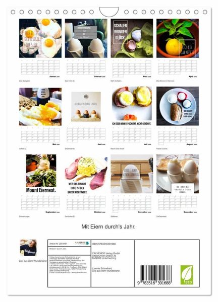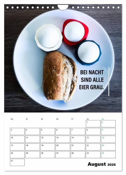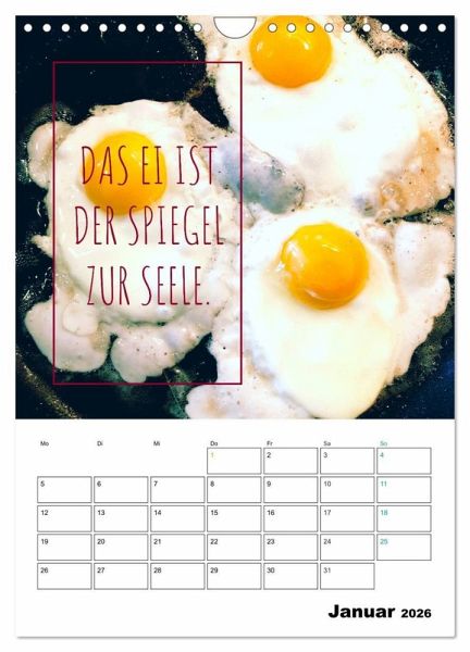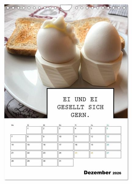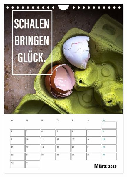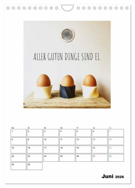 QUALITÄT - Hochwertiger Fotokalender mit 12 wunderschönen Motiven auf lichtbeständigem Bilderdruckpapier, robuste Spiralbindung mit Aufhängebügel.NACHHALTIG - deutliche Abfallreduzierung durch bedarfsgerechte Einzelstückfertigung, umweltfreundliches FSC-zertifiziertes Papier, Produktion in Deutschland, klimabewusste Logistik.PERFEKTES GESCHENK - Kalender für Freunde und Familie, für Kinder und Erwachsene, jung und alt, zu Weihnachten, Geburtstag oder zwischendurch.VIELFALT - Bildkalender in verschiedenen Formaten, z.B. DIN A5, DIN A4, DIN A3 sowie DIN A2. Ob Naturmotiv, Gemälde oder Fotos, ideal für ein persönliches Wohlfühlambiente.Monat für Monat mit einem flotten Ei Spruch in den Tag starten. von Autor(in): Leonie Schreiber