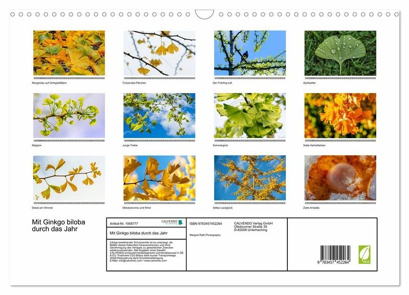 QUALITÄT - Hochwertiger Fotokalender mit 12 wunderschönen Motiven auf lichtbeständigem Bilderdruckpapier, robuste Spiralbindung mit Aufhängebügel.NACHHALTIG - deutliche Abfallreduzierung durch bedarfsgerechte Einzelstückfertigung, umweltfreundliches FSC-zertifiziertes Papier, Produktion in Deutschland, klimabewusste Logistik.PERFEKTES GESCHENK - Kalender für Freunde und Familie, für Kinder und Erwachsene, jung und alt, zu Weihnachten, Geburtstag oder zwischendurch.VIELFALT - Bildkalender in verschiedenen Formaten, z.B. DIN A5, DIN A4, DIN A3 sowie DIN A2. Ob Naturmotiv, Gemälde oder Fotos, ideal für ein persönliches Wohlfühlambiente.Mit seinen einzigartigen, fächerförmigen Blättern ist der Ginkgobaum in Parks und Gärten eine Augenweide. von Autor(in): Margret Rath