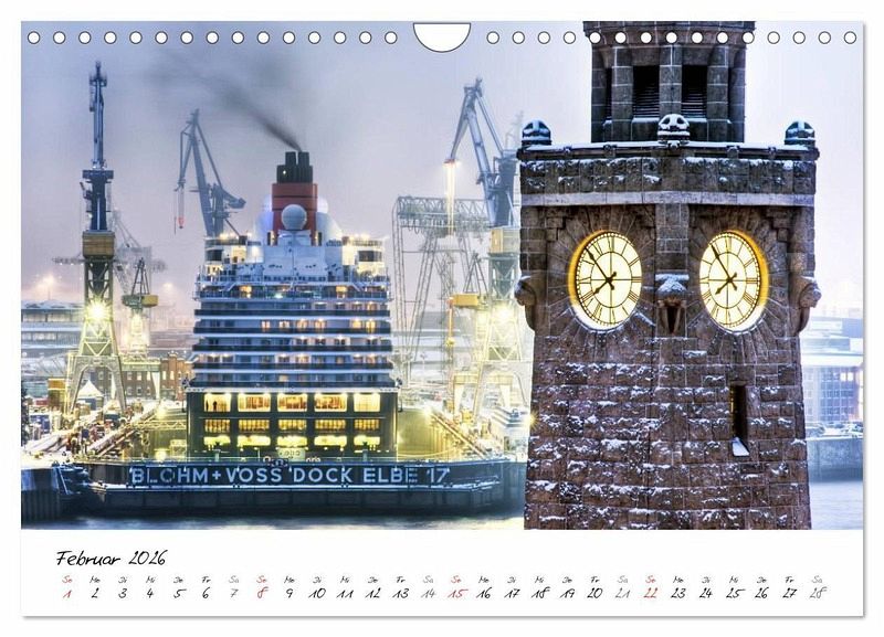 Februar: Ein Kreuzfahrtschiff im Dock und der Uhrenturm der St. Pauli Landungsbrücken