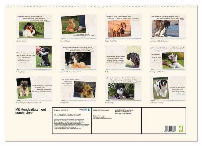 Kalendarium mit 13 ausgewählten Hundefotos und passenden Zitaten zum Thema Hunde.