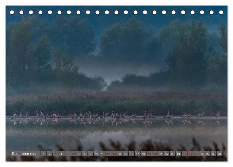 Dezember: Kraniche im Morgennebel am Schlafplatz vor dem Abfllug