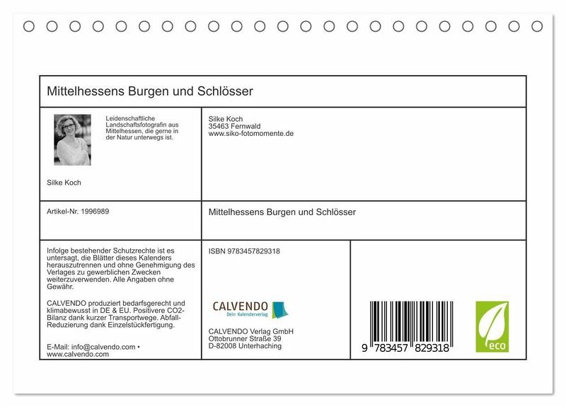 QUALITÄT - Hochwertiger Fotokalender mit 12 wunderschönen Motiven auf lichtbeständigem Bilderdruckpapier, robuste Spiralbindung.NACHHALTIG - deutliche Abfallreduzierung durch bedarfsgerechte Einzelstückfertigung, umweltfreundliches FSC-zertifiziertes Papier, Produktion in Deutschland, klimabewusste Logistik.PERFEKTES GESCHENK - Kalender für Freunde und Familie, für Kinder und Erwachsene, jung und alt, zu Weihnachten, Geburtstag oder zwischendurch.VIELFALT - Bildkalender in verschiedenen Formaten, z.B. DIN A5, DIN A4, DIN A3 sowie DIN A2. Ob Naturmotiv, Gemälde oder Fotos, ideal für ein persönliches Wohlfühlambiente.13 farbenfrohe romantische Ansichten von Mittelhessens Burgen- und Schlösserwelt von Autor(in): Silke Koch